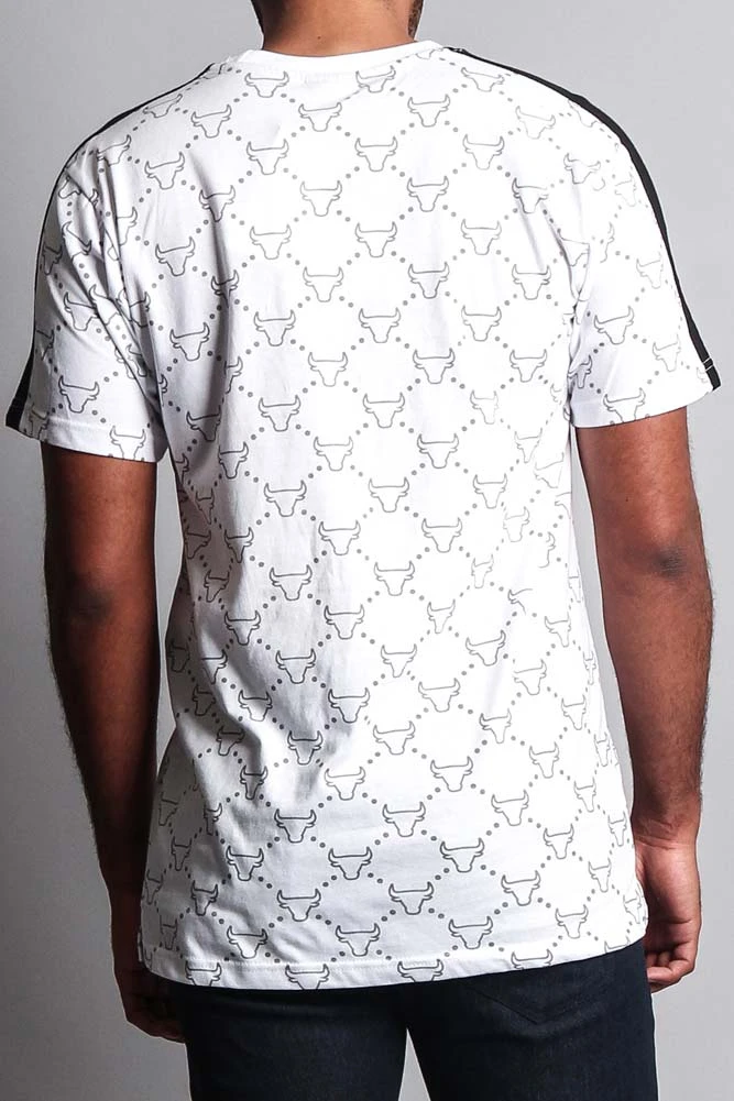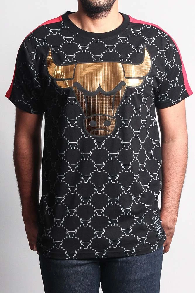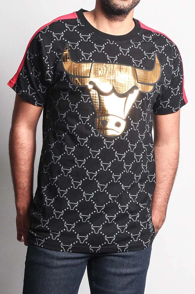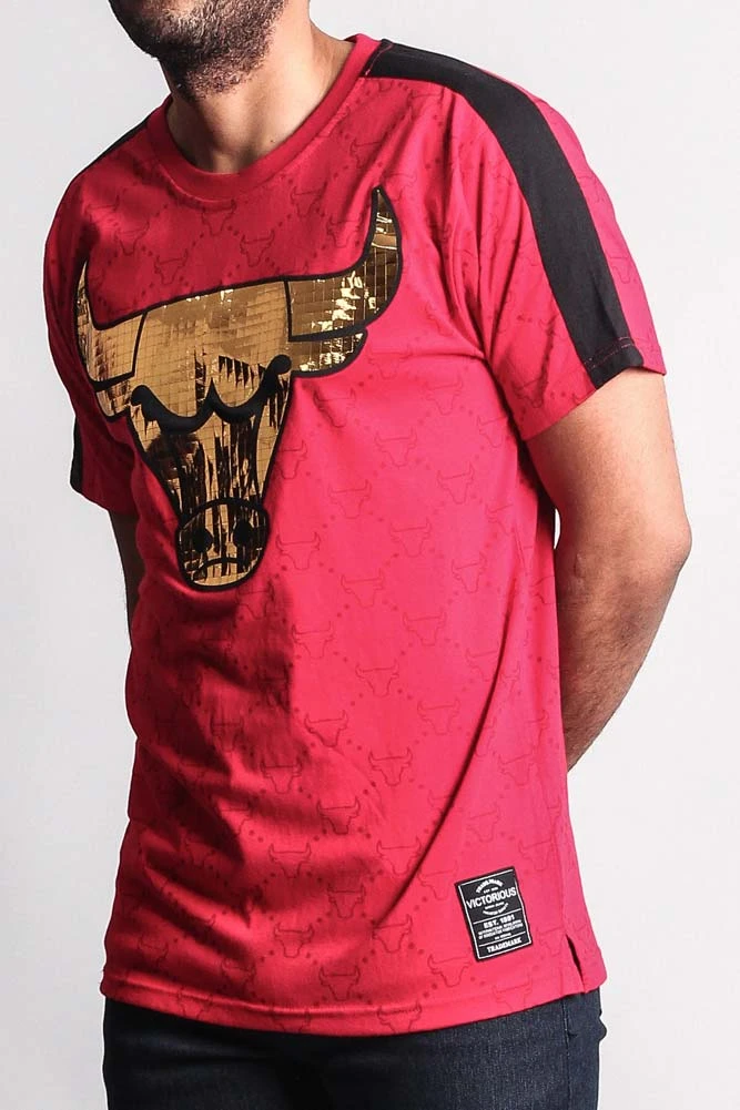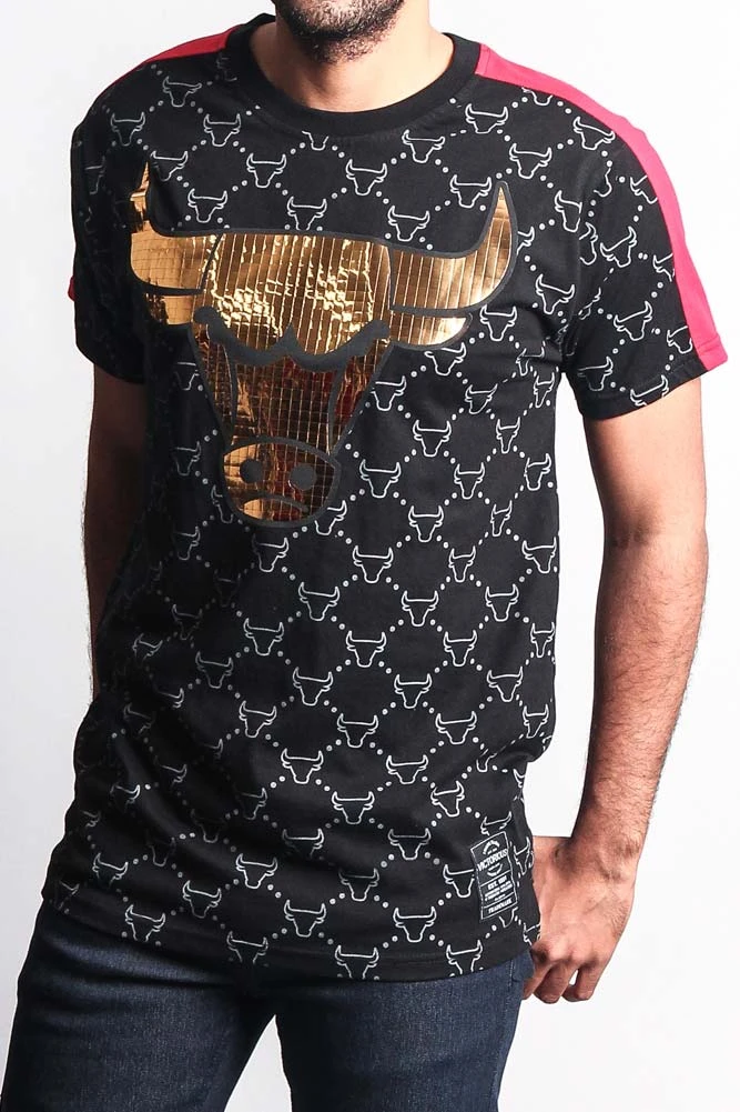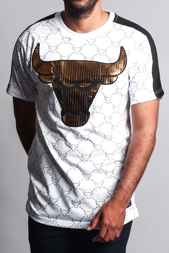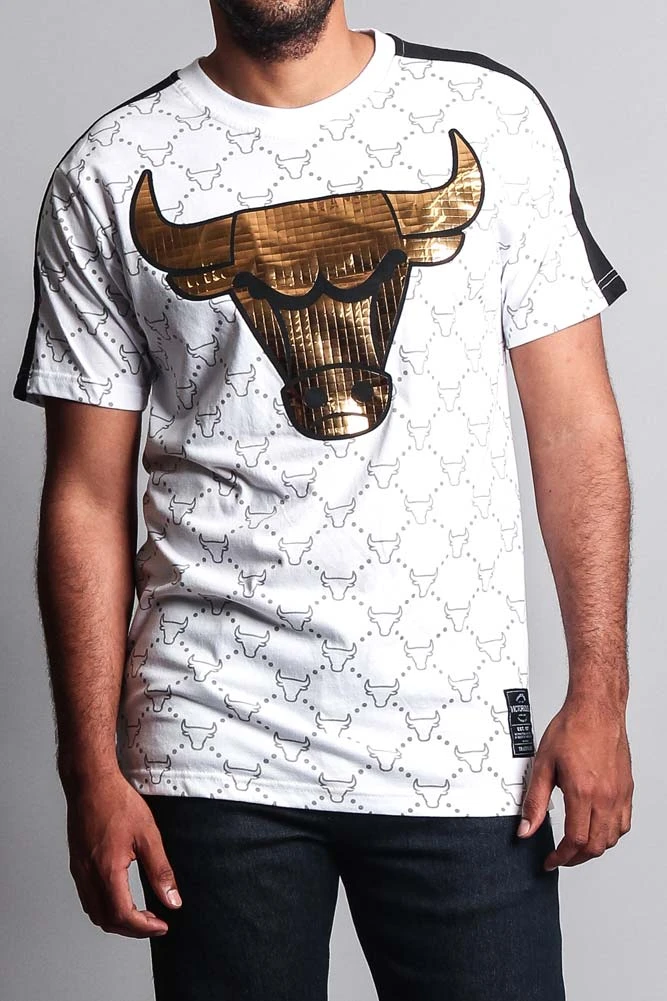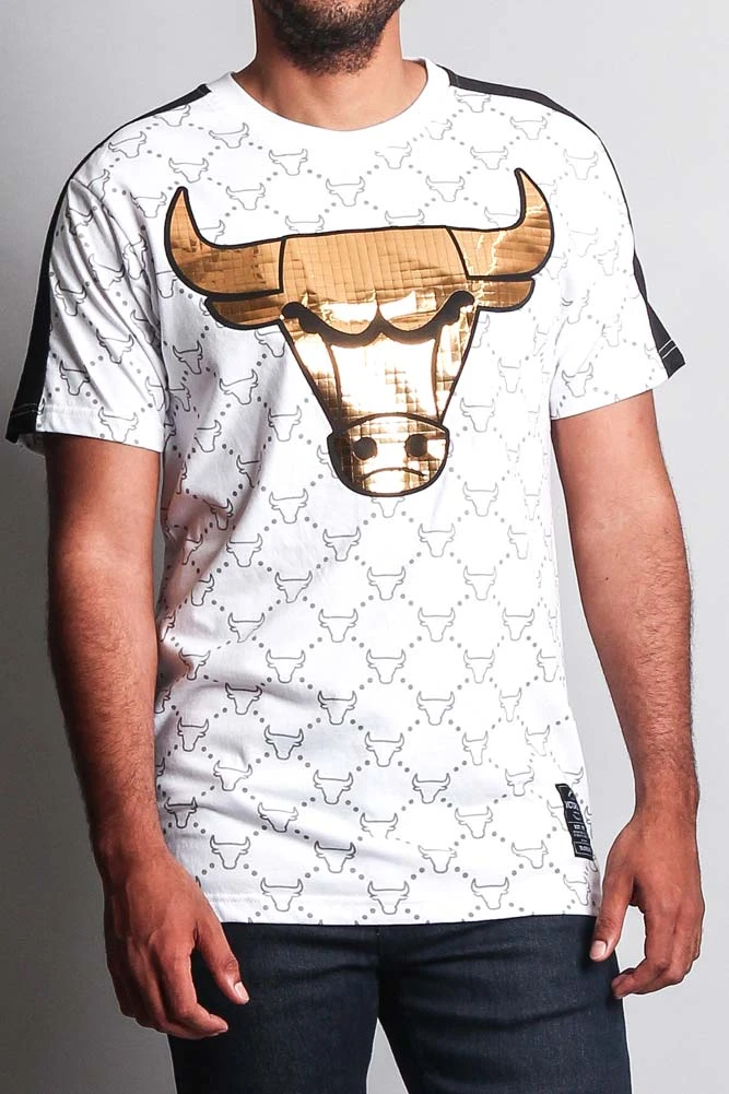 Make sure to catch up on the new trends with our metallic golden bull detailing, sure to catch the attention of any fashionista. This shirt is full of details featuring a golden foil bull, contrasting stripes down the shoulders, as well as a trendy bull background. Available in three colors to compliment anyone.