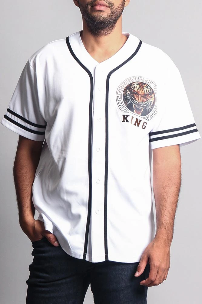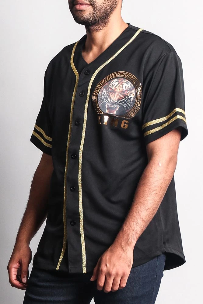 Stand out and look like a boss with our King Tiger baseball jersey. Perfect for layering and versatile wear. Features metallic foil lettering.