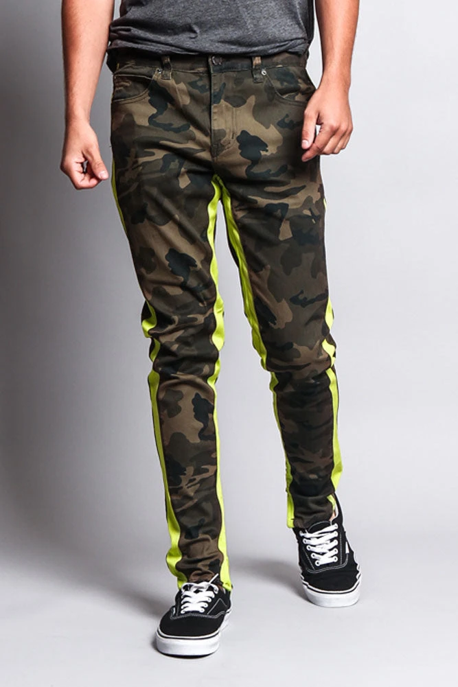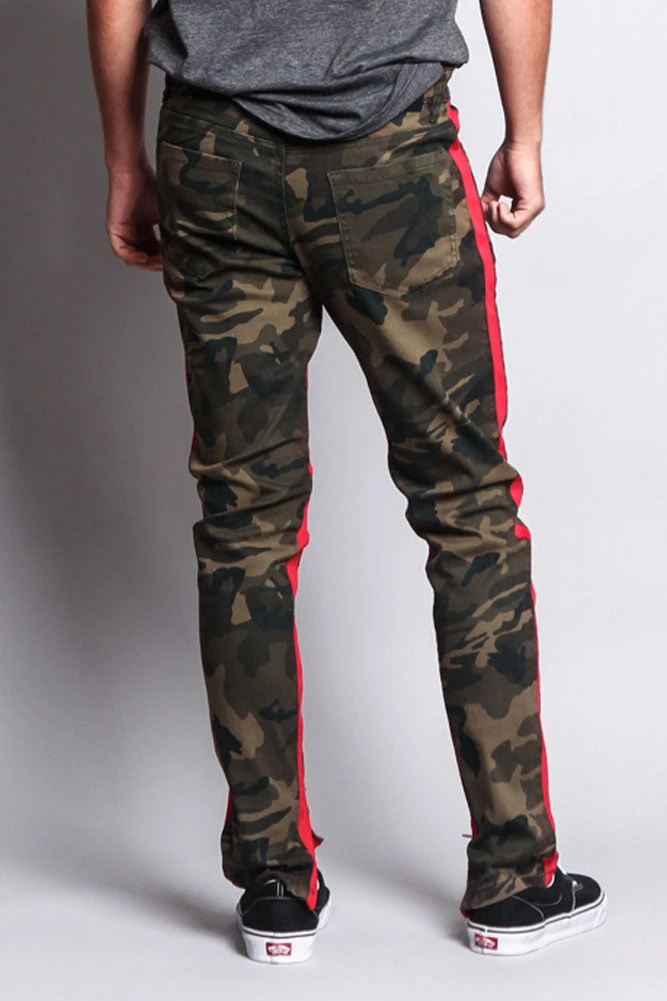Classic camo pants with a pop of color, perfect for dressing up any casual look.Â