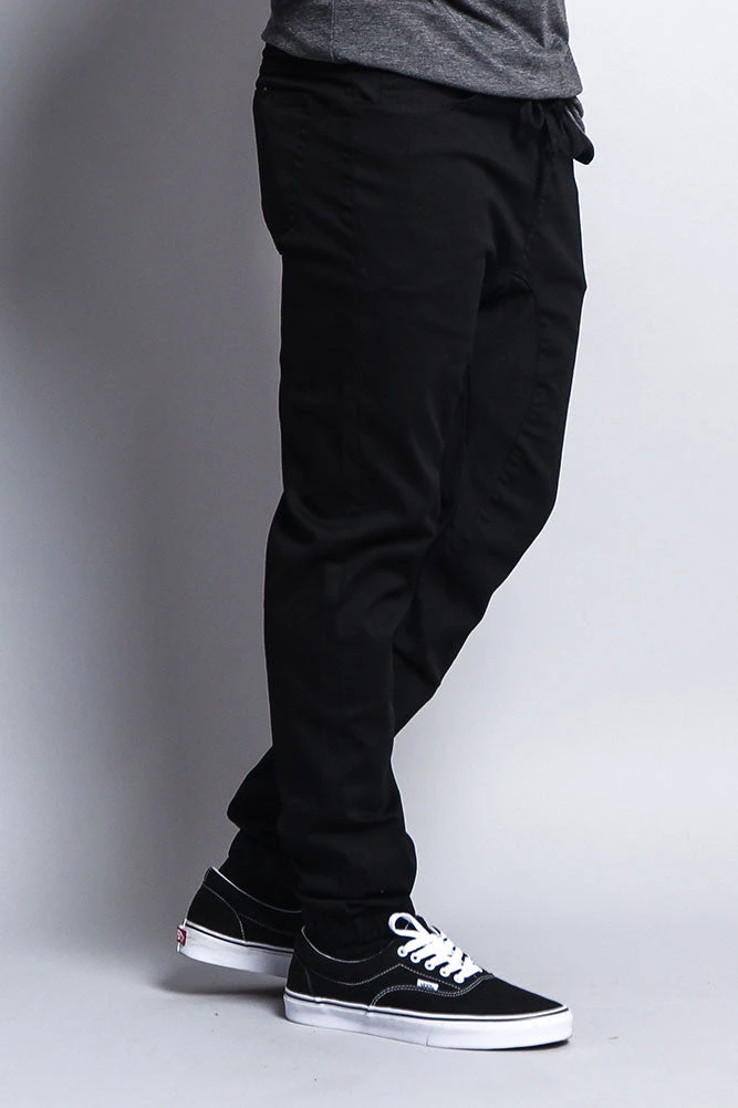 - Drop-crotch, loose through thigh, extreme tapered leg, elastic drawstring waist, elastic cuffs