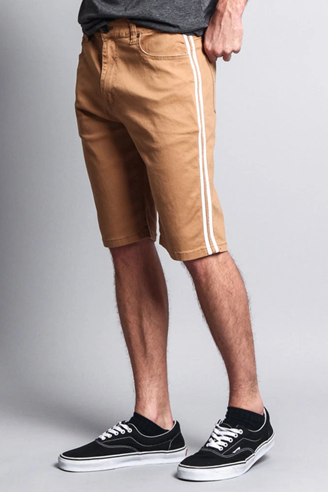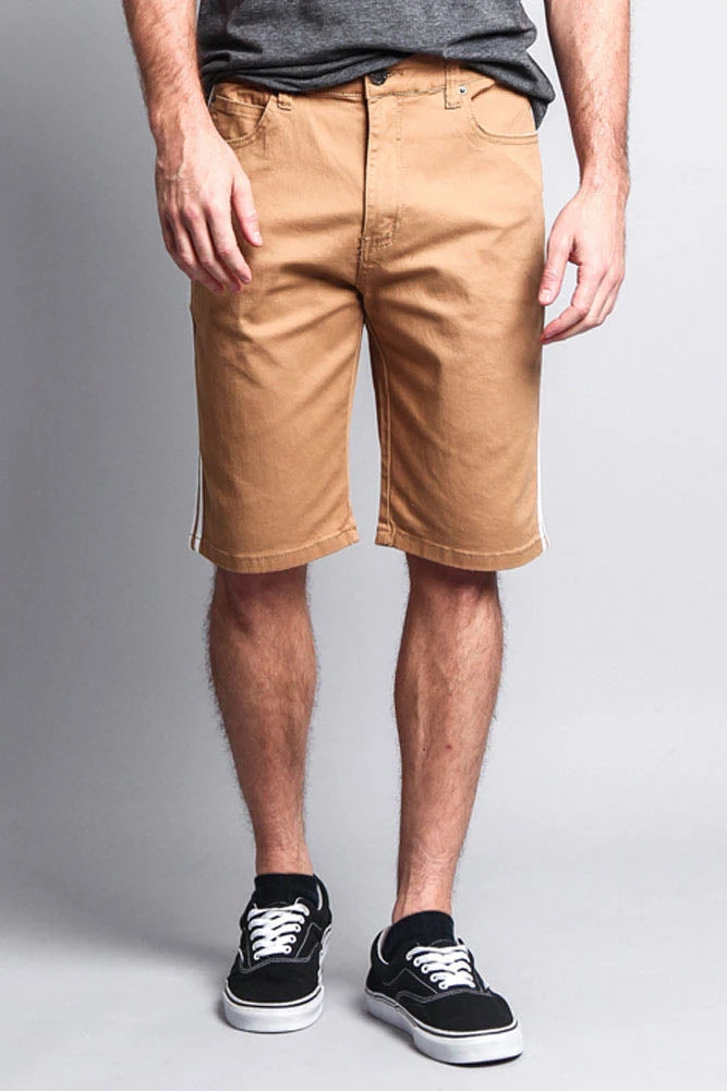Stay cool and stay in style with our trendy new jean shorts featuring two contrasting stripes down the sides.Â