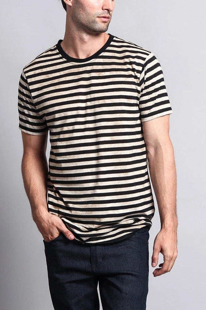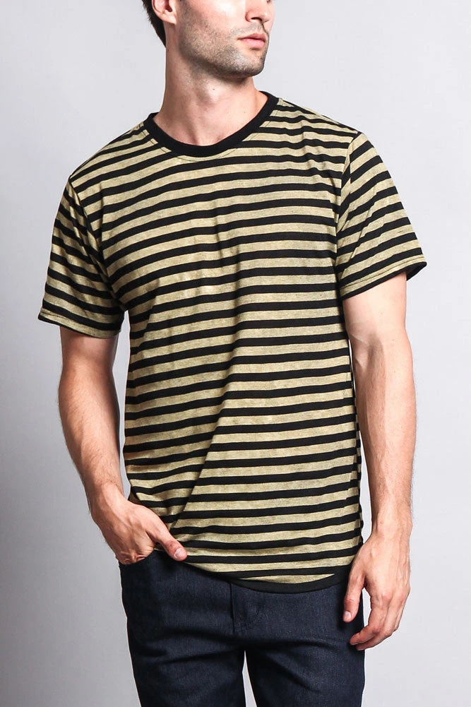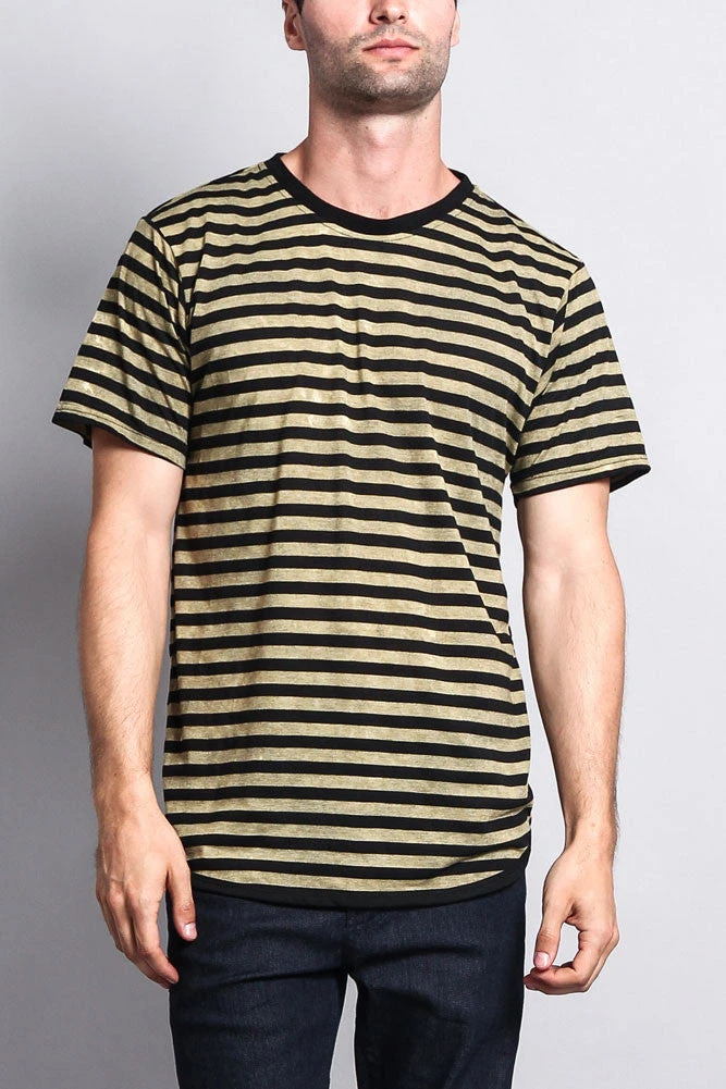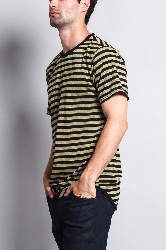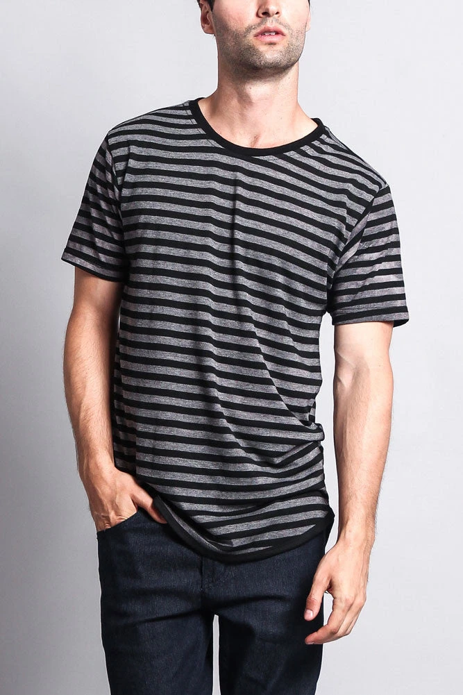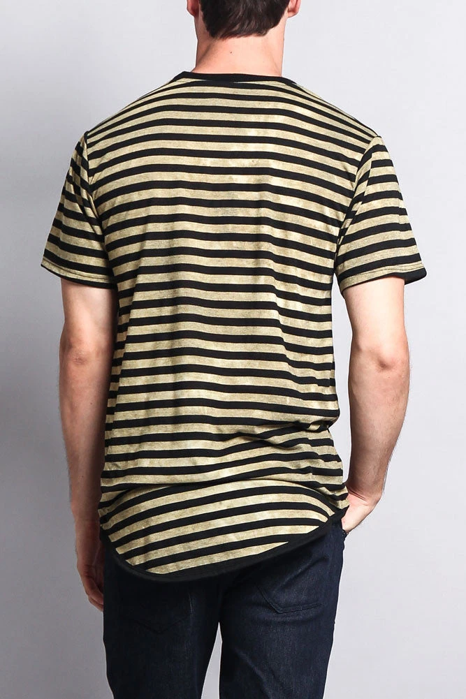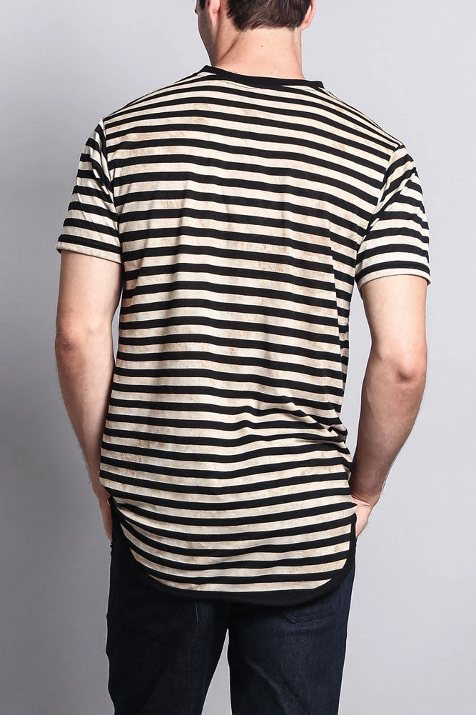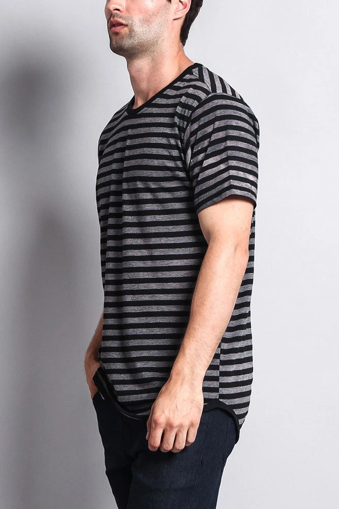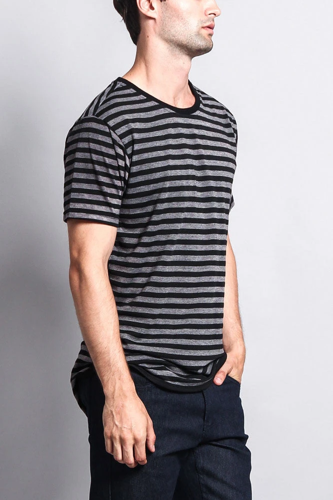 Upgrade your basic t-shirt with this trendy stripped extended length curved baseball-style hem tee. Works great as a layering piece!