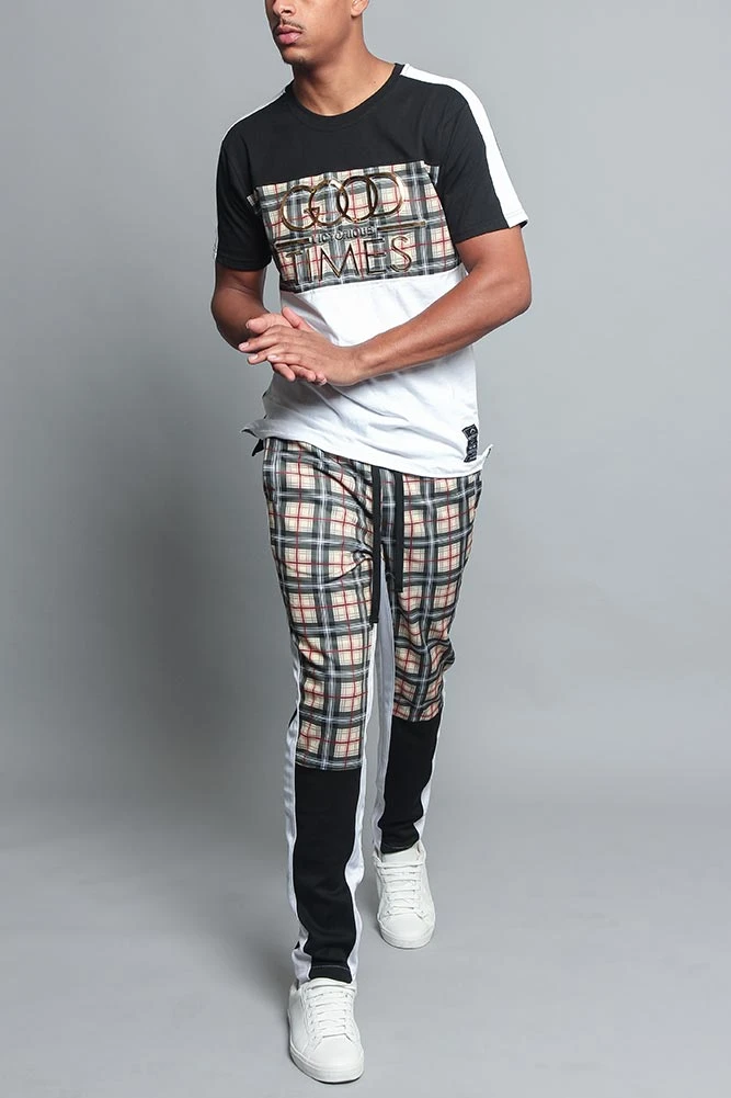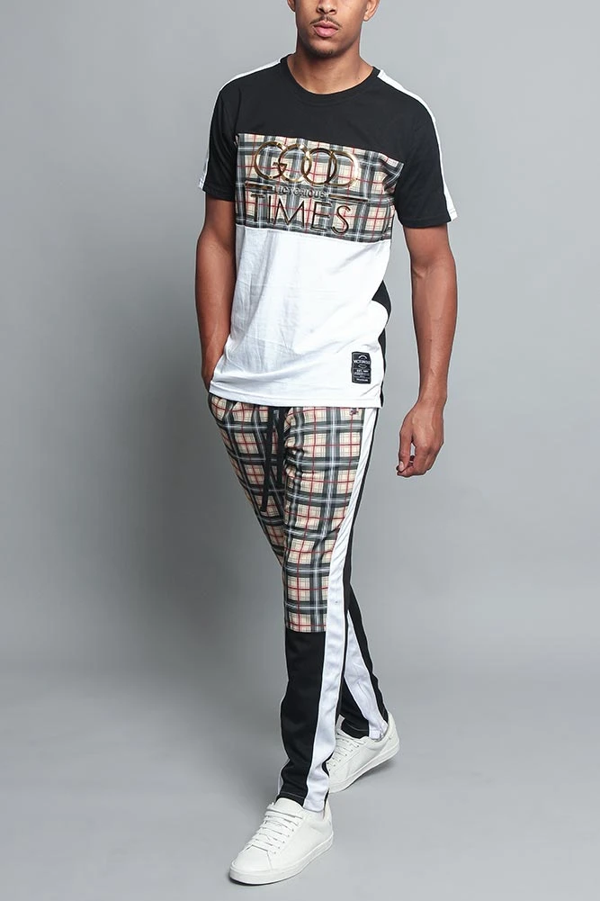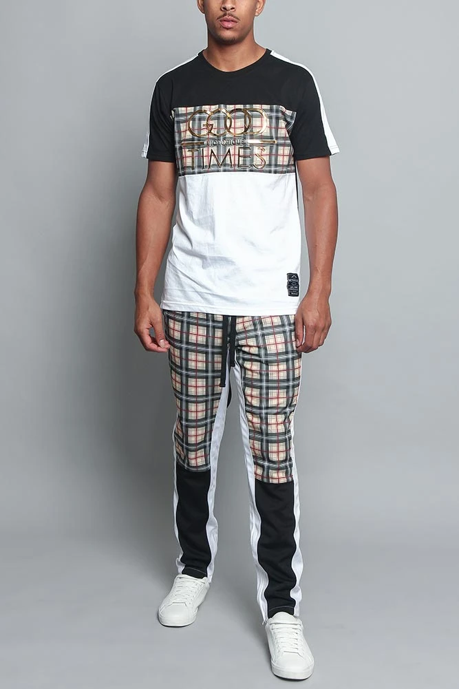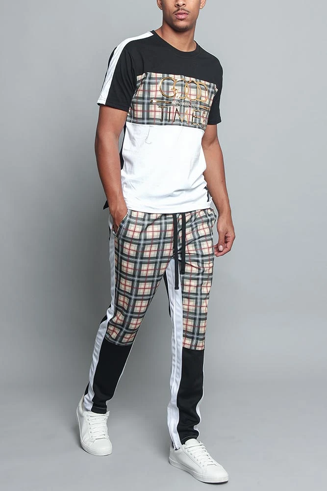 Rock our new plaid track pants and t-shirt set, available in four colors. This stylish set features a plaid design inspired by the latest fashion trends to easily create an outfit sure to impress any fashion forward icon. With an adjustable waist band and zippers by the ankle, this fit provides a custom fit!Â