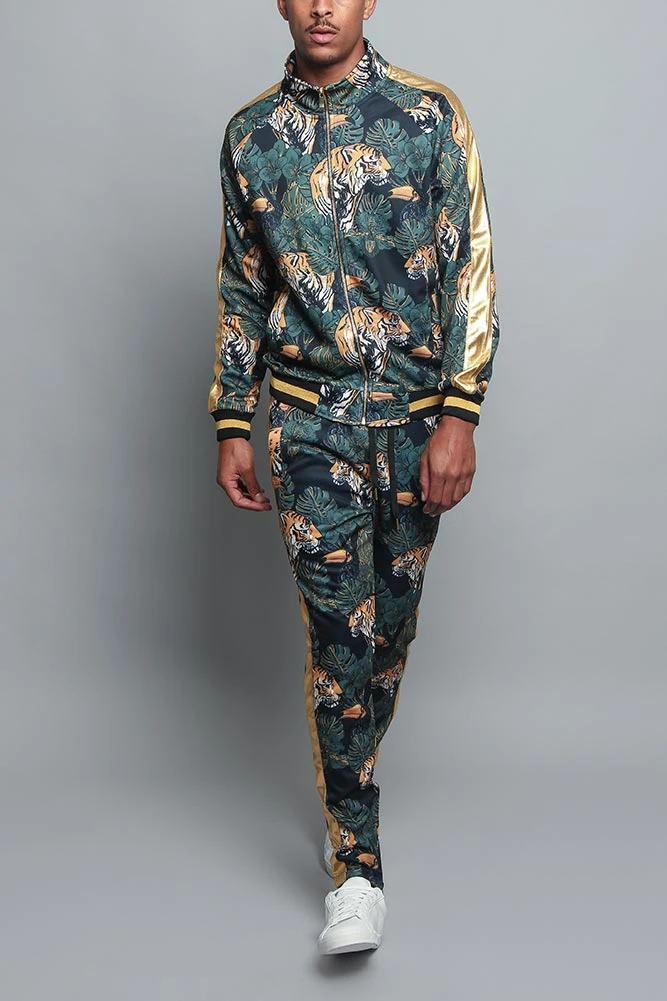Follow the latest trends inspired by your favorite hip hop artists. Feel comfortable and look fly in our tiger track suit featuring, metallic gold strips going down your arms and legs, gold bands around the wrist and waist, an adjustable waistline, and a zipper by the ankle for a custom fit.Â