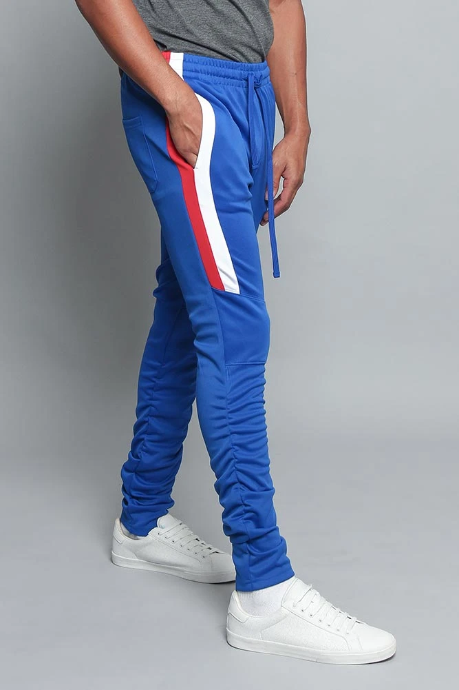 Tired of basic track pants but not the fit? Try our new fitted scrunched up track pants available in four colors and a variety of sizes to flatter anyone. These track pants feature adjustable draw strings, multiple pockets, and an artistically basic color blocking design.